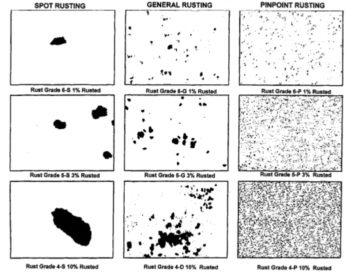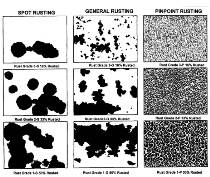 點狀(Spot):試件表面的少數區域出現較大的點狀生銹。片狀(General):試件表面的較大面積的片狀生銹。微小點狀(Pinpoint):試件表面散布的極細小的斑點狀生銹。混合型(Hybrid):包括點狀、片狀、微小點狀幾種現象同時存在的生銹