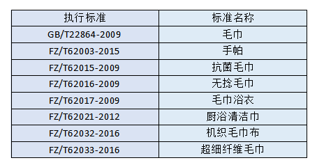 首先,應(yīng)先了解毛巾類(lèi)產(chǎn)品的執(zhí)行標(biāo)準(zhǔn)有哪些,如下表: