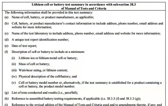 關(guān)于鋰電池檢測的第38.3章節(jié)的部分內(nèi)容修訂有兩處: "i驗概要Lithium cell and battery testsummary" 中: 38.3.5()(i)原"質(zhì)量(Mass) "更改為“電池或電池組質(zhì)量(Mass of cell orbattery) ";