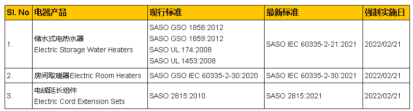 儲水式電熱水器/房間取暖器/電線延長組件SASO標準更新
