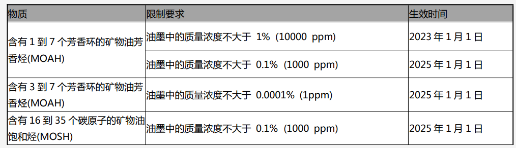(2)在每個截止日期前制造或進口的紙質(zhì)包裝和印刷品,如果符合在這些截止日期之前的含量要求,將有自這些截止日期起12個月的庫存處理期。就本法令而言,礦物油是指從用于制造油墨的石油烴衍生的原料生產(chǎn)的油。礦物油作為復雜的碳氫化合物,主要包括直鏈、支鏈烷烴和烷基取代的環(huán)烷烴(MOSH)以及烷基取代的芳香烴(MOAH)兩大類。通過飲食攝入人體內(nèi)的礦物油易在人體內(nèi)發(fā)生集聚,給人體健康帶來巨大的損害。2017年10月27日,世界衛(wèi)生組織國際癌癥研究機構(gòu)公布的致癌物清單中,將未經(jīng)處理或輕度處理的礦物油列入1類致癌物清單,礦物油、高精煉油在3類致癌物清單